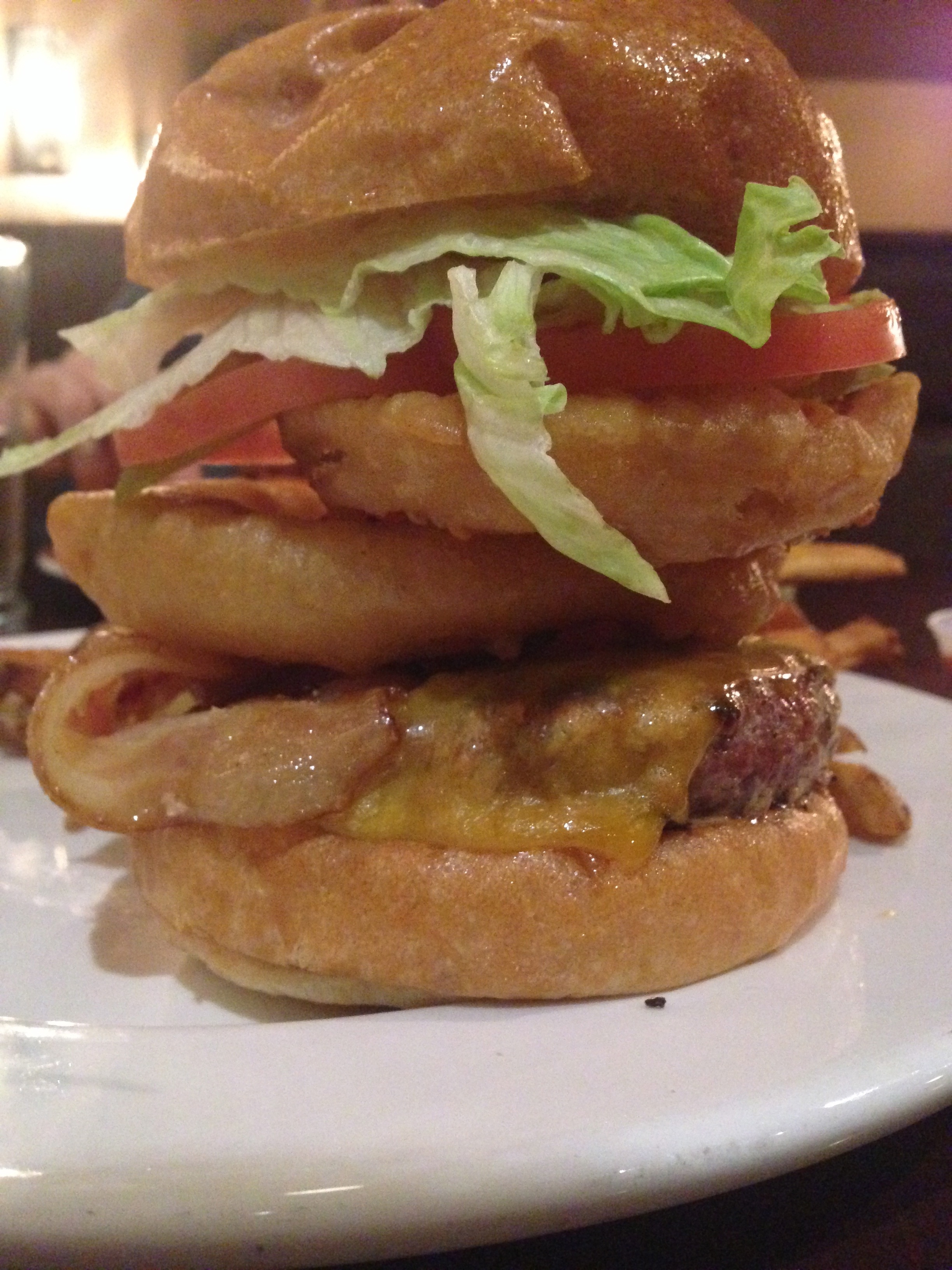 As soon as the plate was placed in front of me, I noticed two things. First, the size of the enormous onion rings that were piled on top of this burger. Second, was the mouth-watering slice of thick cut bacon. Both of these things made me both nervous and excited. Nervous because the size of this burger was going to take some serious burger handling in order to even get a proper bite. Excited because this looked like one of the most delicious things I have ever had put in front of me.