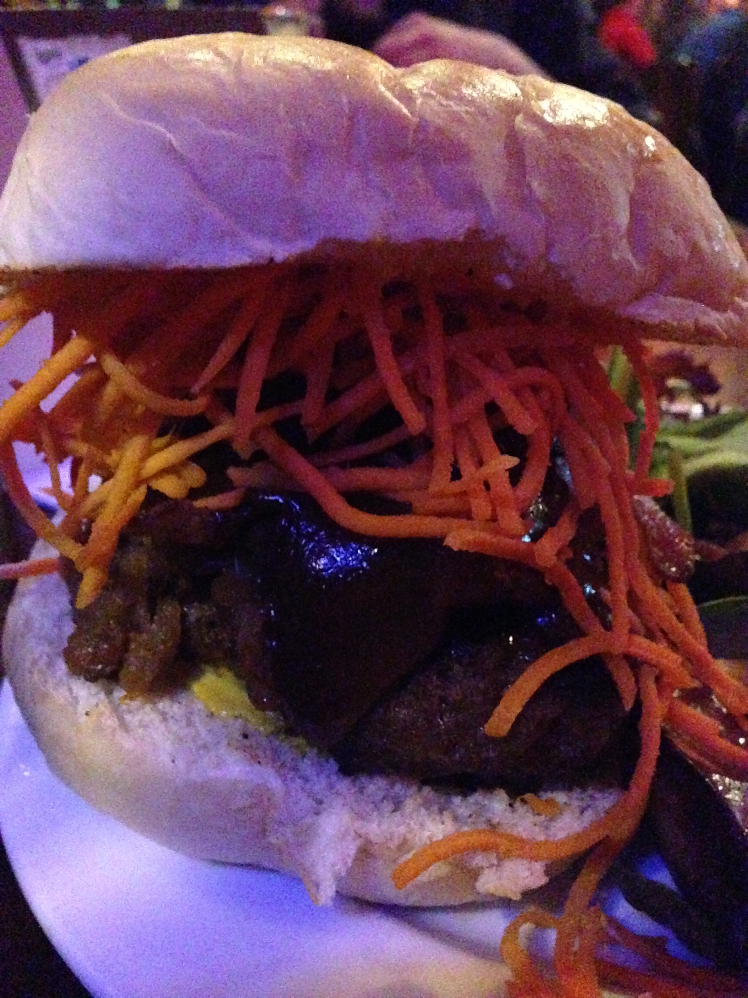 From the menu: “Our Big Arse Patty with peanut sauce, caramelized onions, bacon, mustard, mayo, and shredded carrots.”