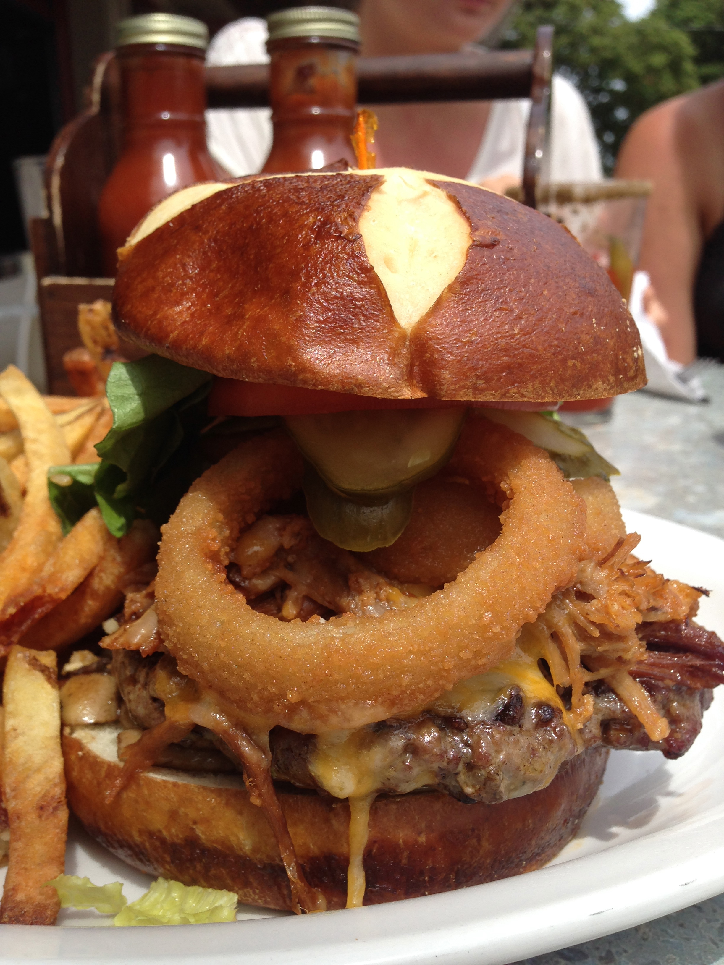 After taking a few bites, I realized that this burger had a few delicious surprises. The first was the hickory smoked pulled pork. It was so tender and juicy, and I couldn’t get enough of it. I was also really pleased with the mushrooms on this burger. They added a great contrast to the meaty components of the burger, and they really were a nice touch. My favorite part of the burger, however, was the onion rings. I don’t know who first came up with the idea to put them on a burger, but they definitely deserve a high five. The pretzel bun was super tasty, and this type of bun has easily become my favorite style. This burger does get fairly messy, mostly due to the large quantity of toppings, and I’m a little ashamed to say that I did have to eat the last few bites with a fork and knife.