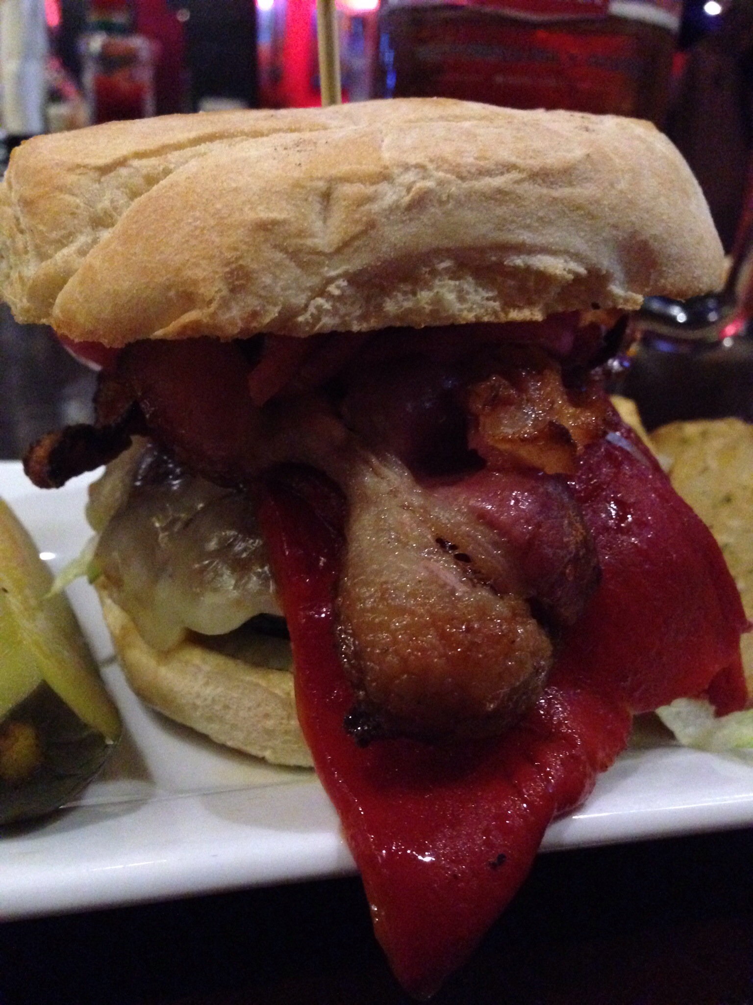 From the menu: “100% pure sirloin beef patty, pepper jack cheese, roasted red peppers, tomatoes, lettuce, sweet onion, bacon with house aioli”