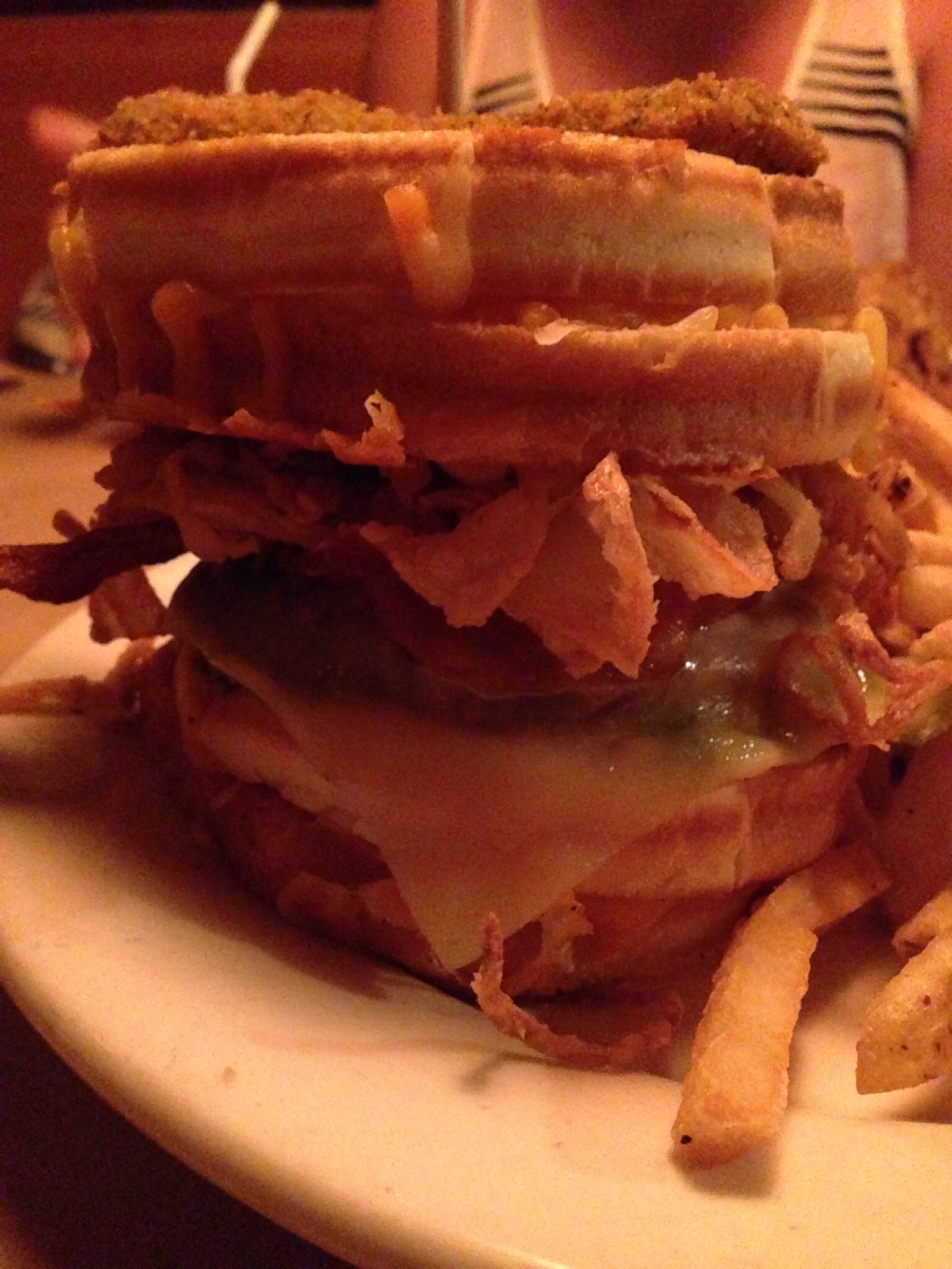 From the menu: “A juicy sirloin burger between two grilled cheese sandwiches, topped with smoky bacon, Monterey Jack cheese, crispy Cajun onions, sriracha ketchup and mayo”