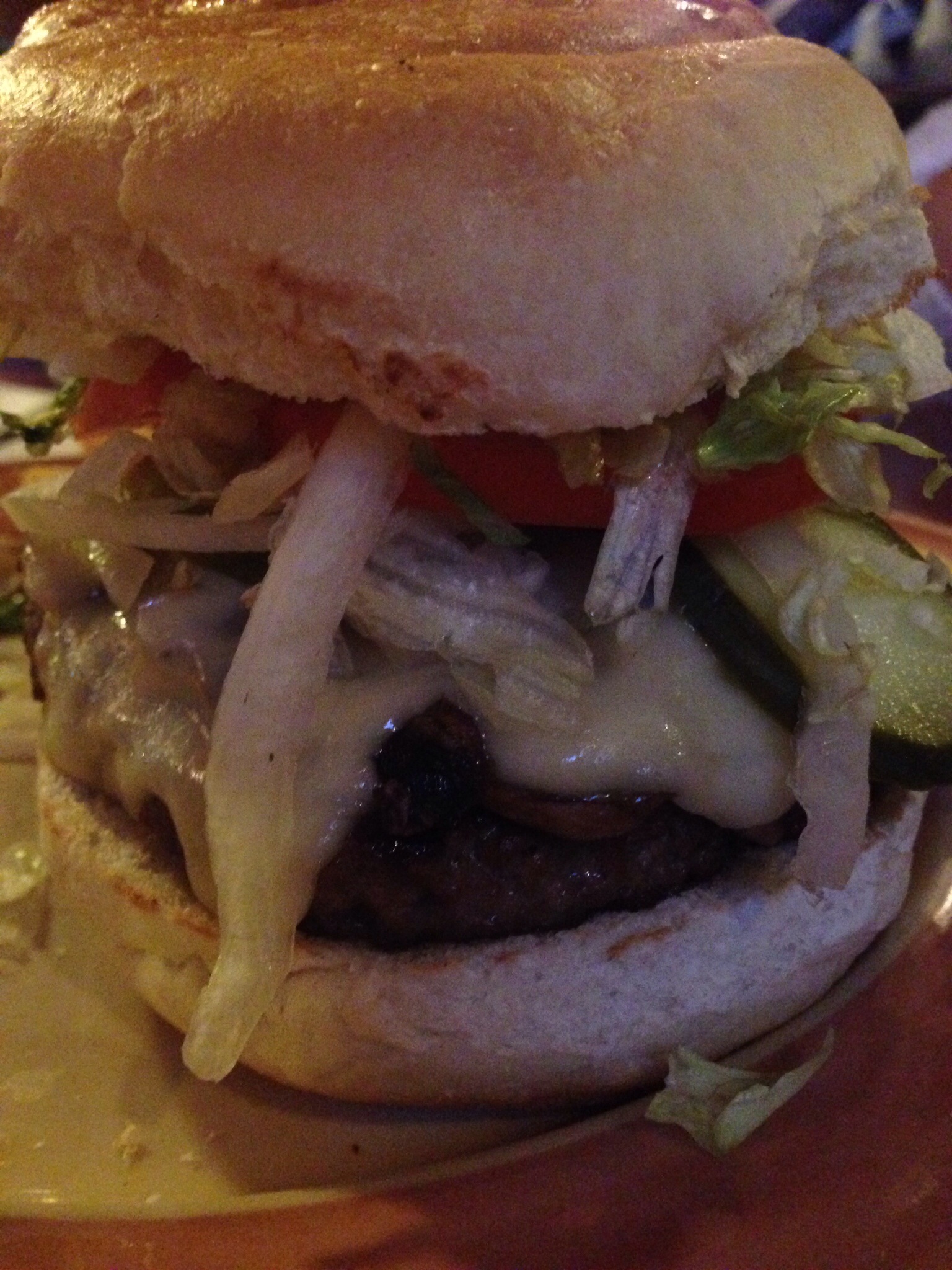 From the menu: “100% Pure beef patty smothered in sautéed mushrooms and Swiss cheese, with lettuce, onion, tomato and pickle”