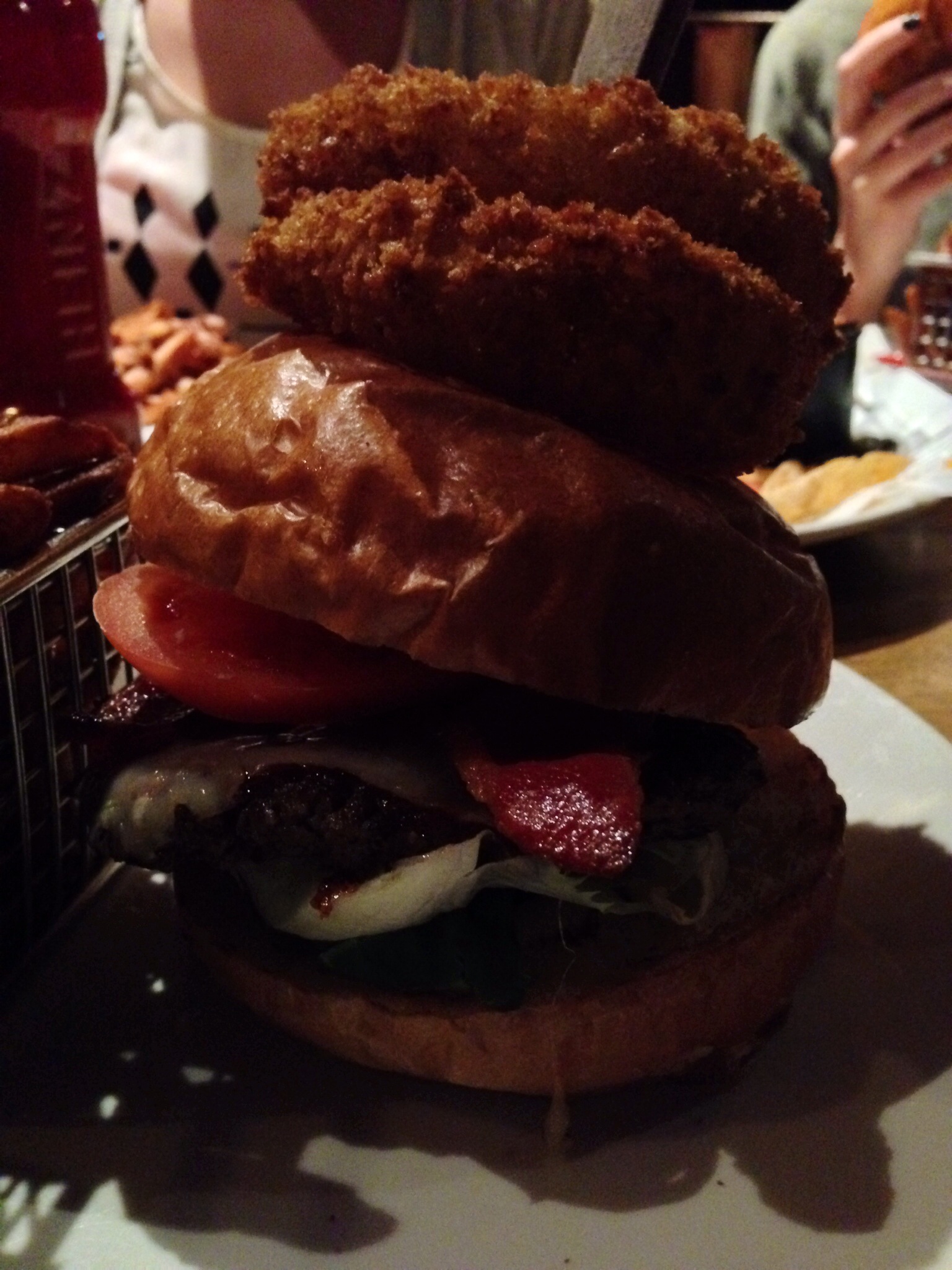 From the menu: “Whiskey apple BBQ sauce, crispy bacon, maple smoked cheddar, Guinness honey mustard, lettuce and tomato on a toasted bun. Topped with two house-made onion rings and served with French fries”
