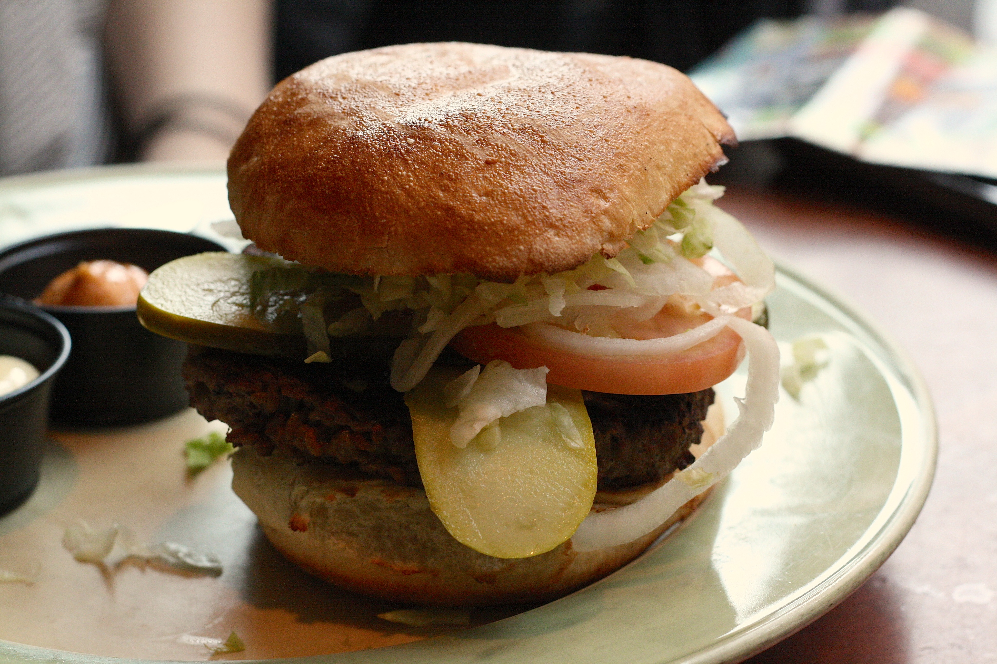 Elaine: “The salmon was well seasoned. I thought the pea sprouts were a nice touch, and the pickled onions added a nice acidity to the burger”