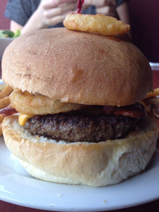 From the menu: “Hand pressed 1/2 pounder; bacon strips, American cheese, onion rings, smokey BBQ mayo”