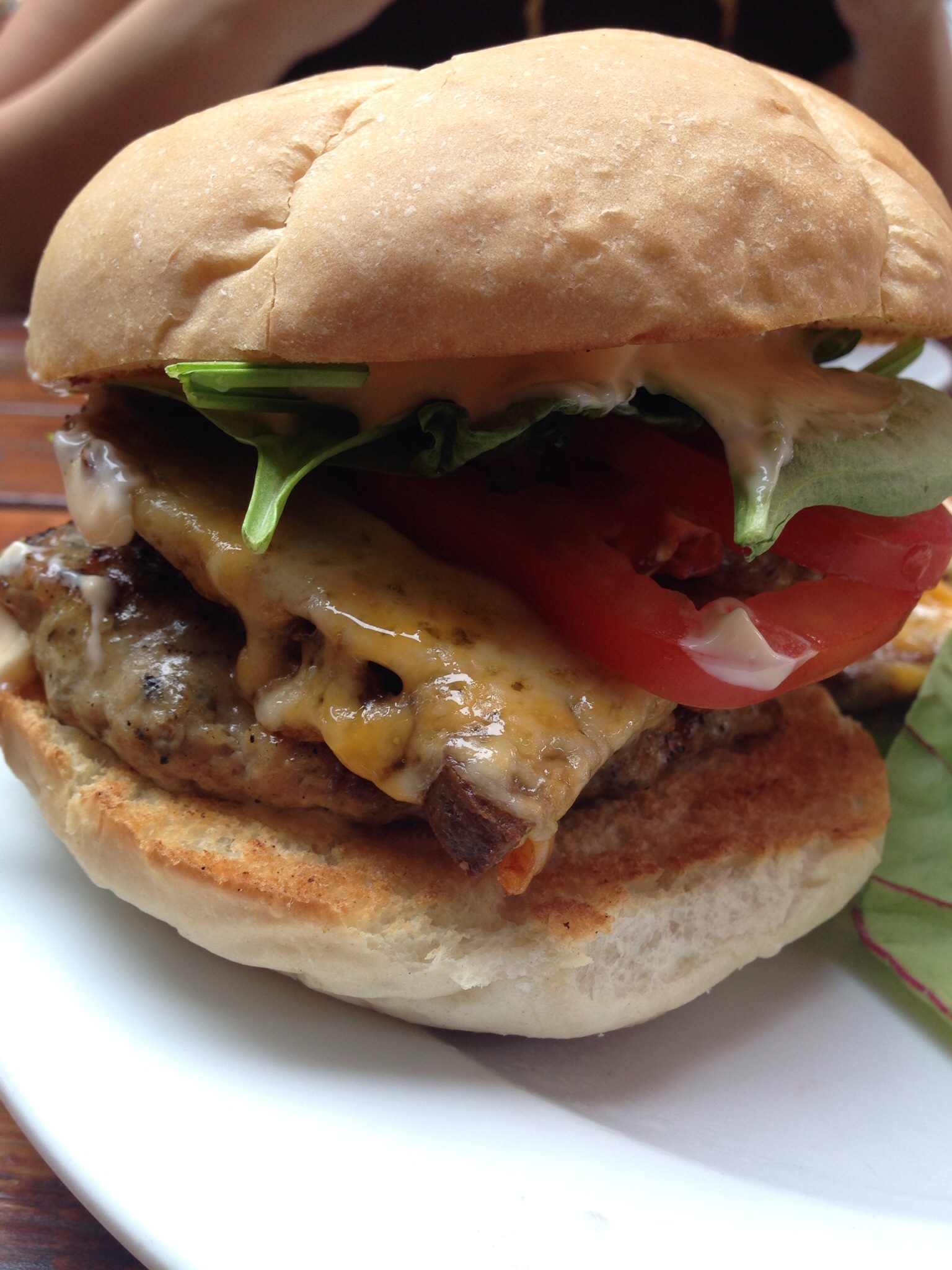 As it was placed in front of me, I couldn’t help but notice the amount of cheese on the burger. I’m a big fan of cheese so this was pretty exciting. I also really liked the two big chunks of Donair meat that were placed on top of the chicken patty. Even the veggies looked nice and fresh (the tomatoes were a really bright red). My mouth was instantly watering.
