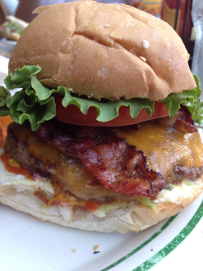 From the menu: “Our traditional BLTCM burger (bacon, lettuce, tomato, cheddar, mayo, mustard, relish, and ketchup) with that stick to the roof of your mouth difference”