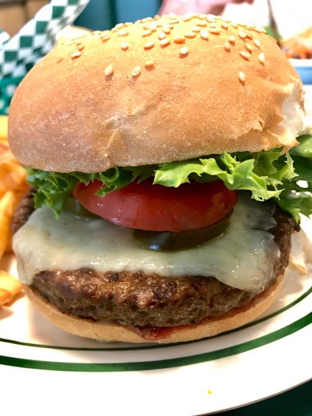 “0% beef burger with salsa, Monterey Jack, lettuce, tomato, mayo and jalapeños”