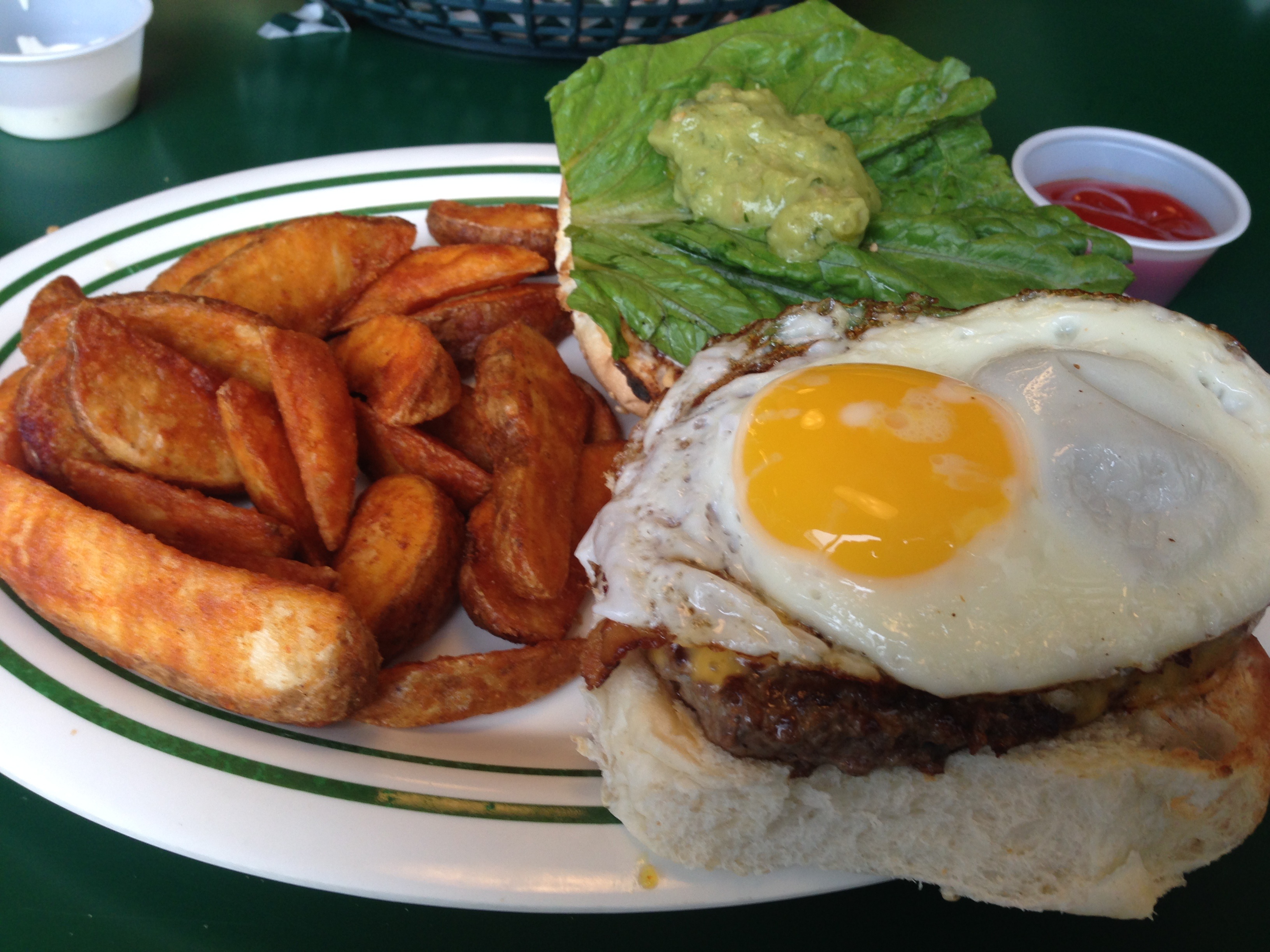 Burger: Doughnut Burger – Maple sausage patty, fried egg, American cheese, tomato, spicy mayo and doughnut bun
