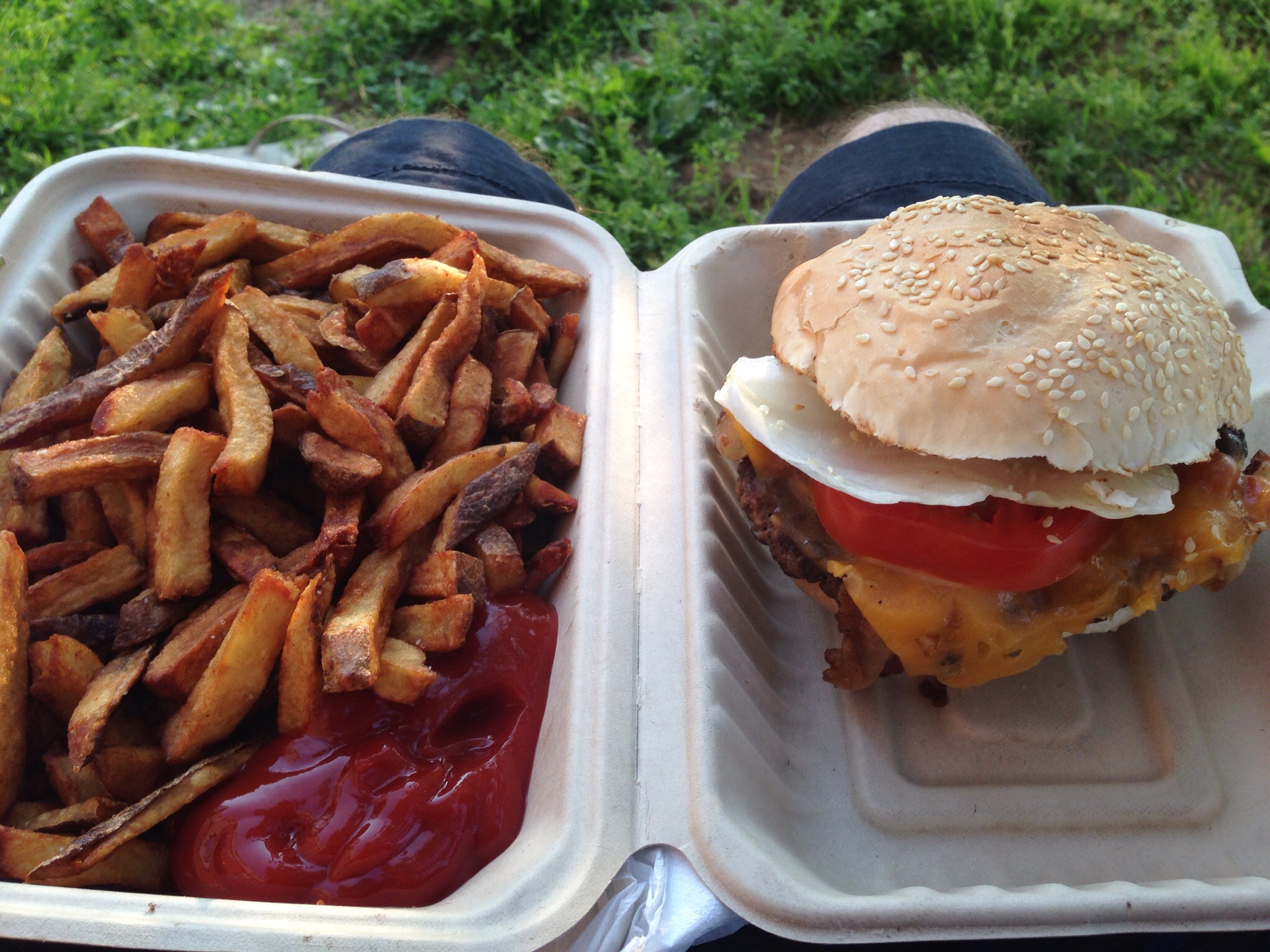 From the menu: “Mayo, lettuce, tomato, 8oz. burger, cheddar cheese, bacon, onion rings, ketchup & BBQ sauce”