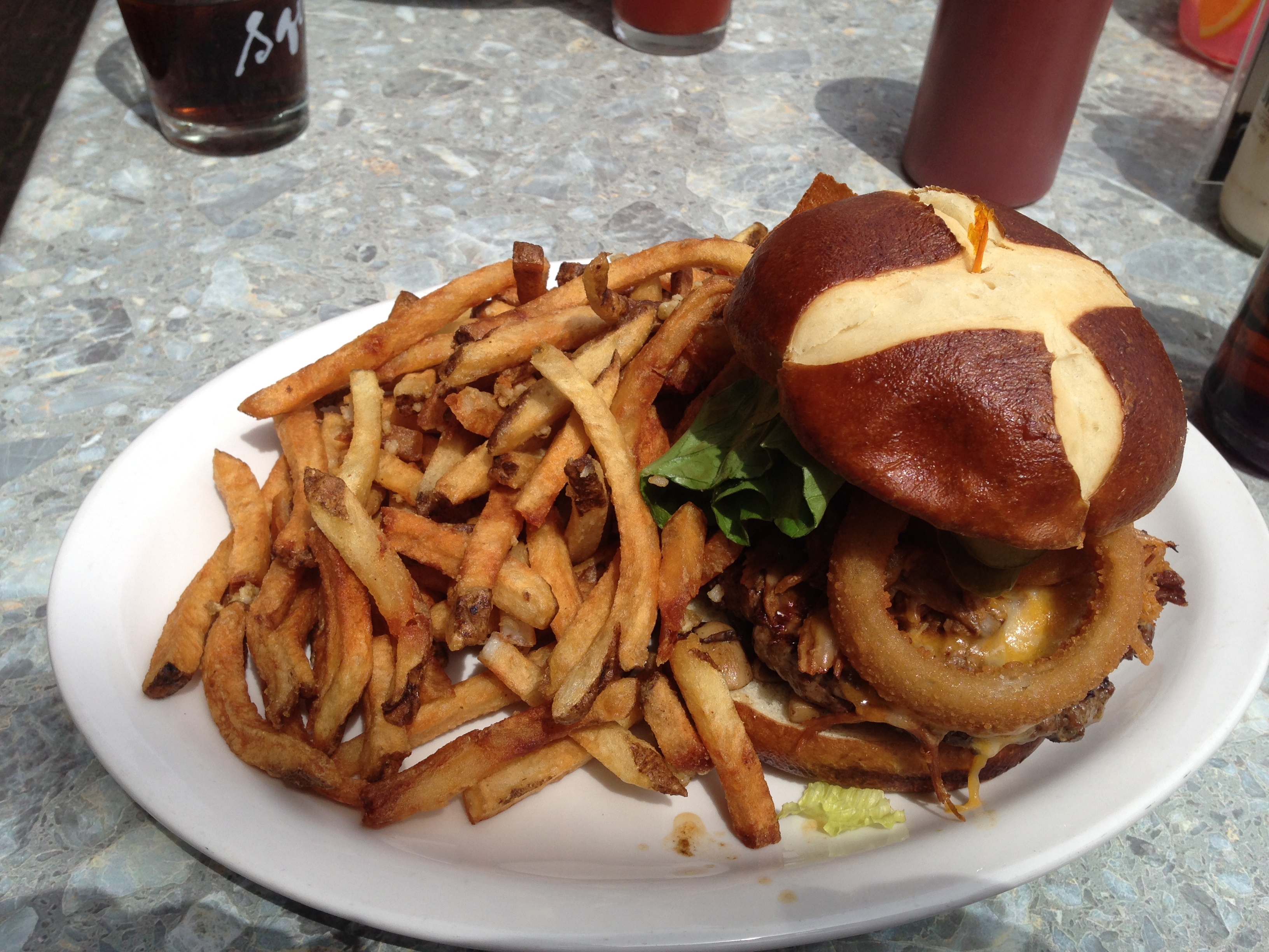 From the menu: “2 seared beef patties, cheddar, mozza, smokey shoulder bacon, pulled pork, onions, ketchup, mustard and Krave sauce, with a grilled cheese in the middle of it all”